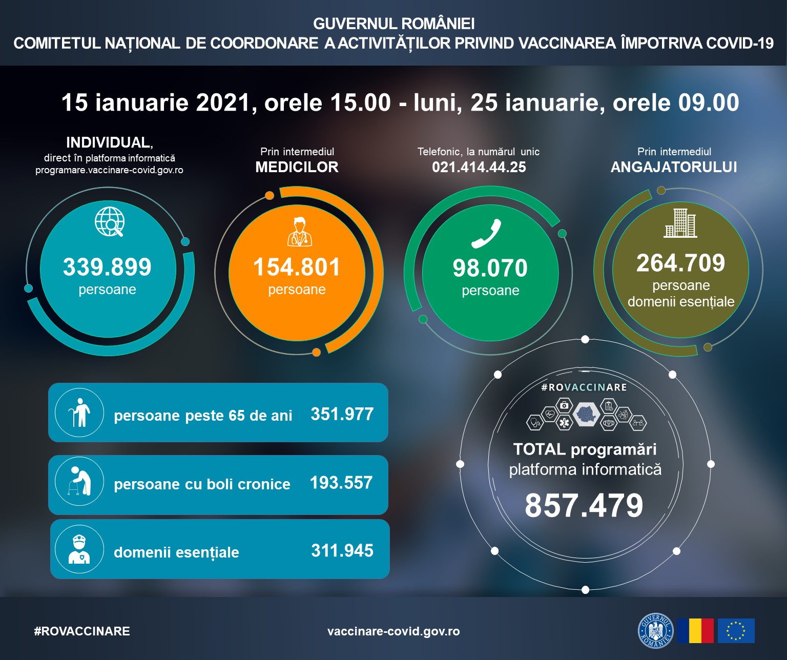 În perioada 15 ianuarie 2021, orele 15:00 până luni, 25 ianuarie, orele 09:00, pe platforma informatică programare.vaccinare-covid.gov.ro s-au programat 857.479 persoane din etapa a II-a de vaccinare (351.977 adulți peste 65 ani, 193.557 persoane cu afecțiuni cronice și 311.945 angajați din domenii esențiale).