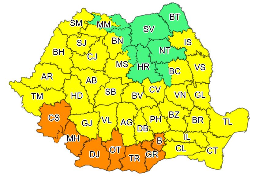 Judeţele marcate cu Cod galben sunt: Satu Mare, Sălaj, Cluj, Alba, Hunedoara, Sibiu, Vâlcea, Braşov, Argeş, Covasna, Prahova, Dâmboviţa, Vrancea, Buzău Brăila şi Galaţi.