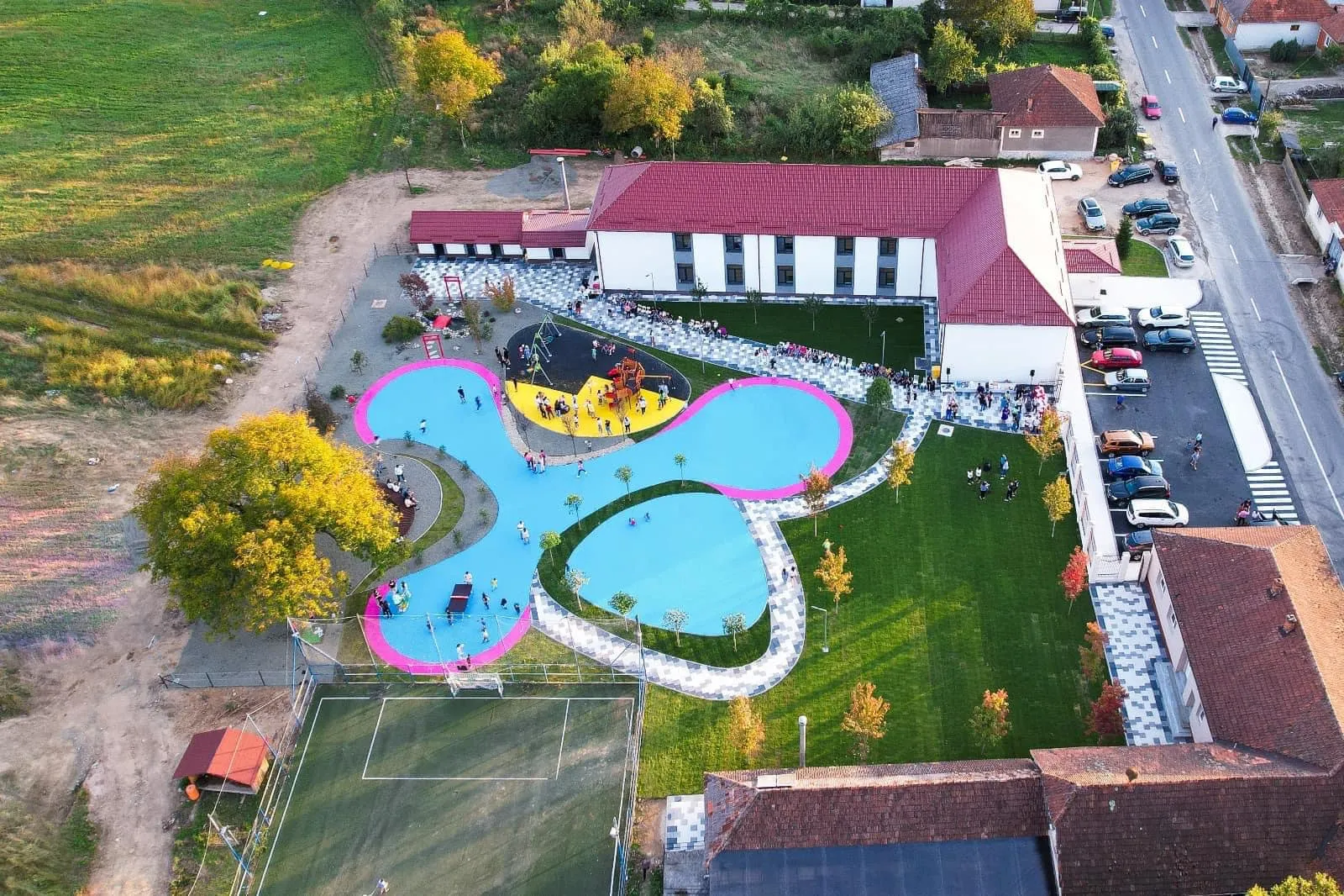 Curtea școlii a fost amenajată cu gazon și tartan, amfiteatru pentru cursuri în aer liber, cinematograf și locuri de joacă pentru cei mici.