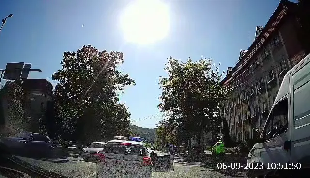 Un polițist a fost filmat de un șofer cu camera pe bord în timp ce a oprit mașina de poliția și a ajutat un bătrânel să traverseze strada.