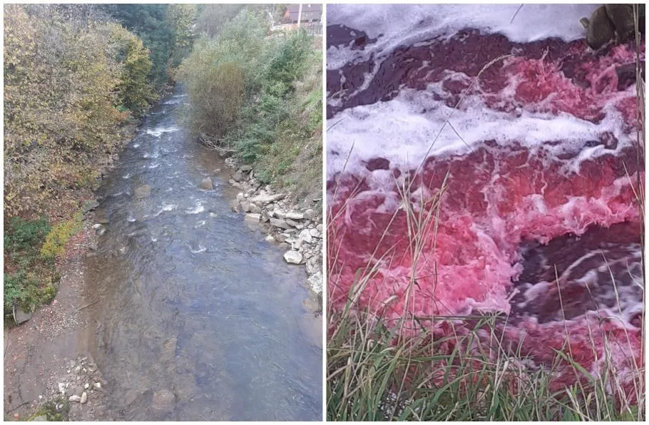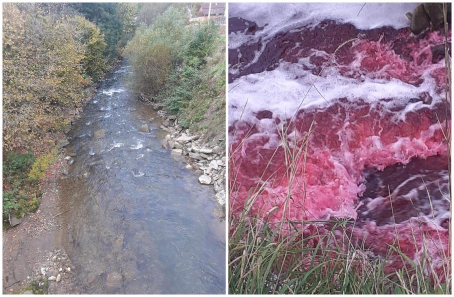 FOTO - Apa unui râu din România s-a colorat peste noapte în roşu: „E foarte ciudat, miroase puţin a oţet”