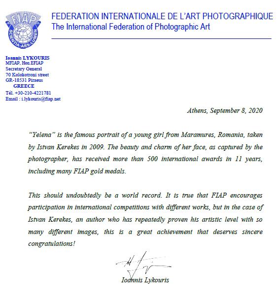 Autorul fotografiei, artistul Kerekes Istvan este din Târgu Mureș și are un palmares foarte bogat cu multe premii internaționale. Portretul Yelenei, fetița surprinsă pe prispa unei case din Maramureș, în 2009, a depășit orice așteptări. Autorul a obținut 600 de premii internaționale în 58 de țări și este deținătorul unui record mondial pentru cea mai apreciată fotografie portret de până acum. De atunci un alt fotograf nu a mai reușit această performanță.