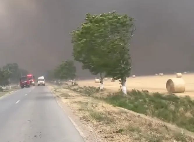 În aceleași imagini apar și autospeciale ale ISU Crișana, Detașamentul Salonta, mobilizate pentru stingerea unui incendiu de vegetație izbucnit pe fondul condițiilor meteo extreme, după cum a confirmat plutonierul Alina Butaci.