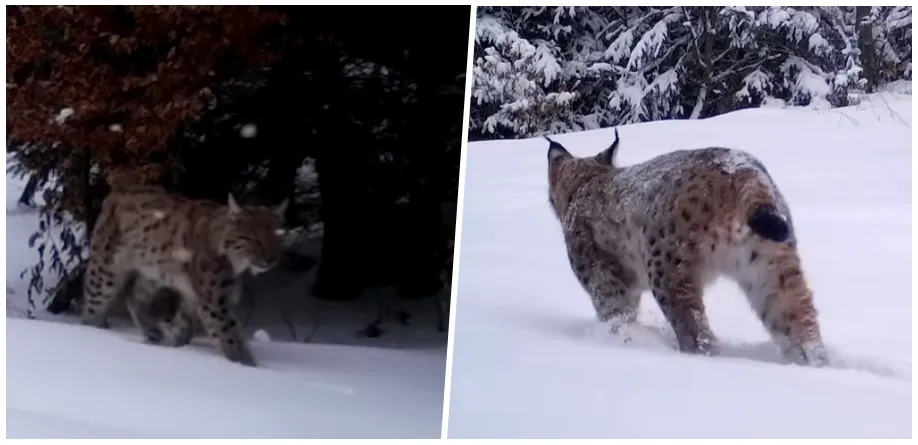 Un râs superb a fost filmat plimbându-se prin zăpadă, în Munții Apuseni.