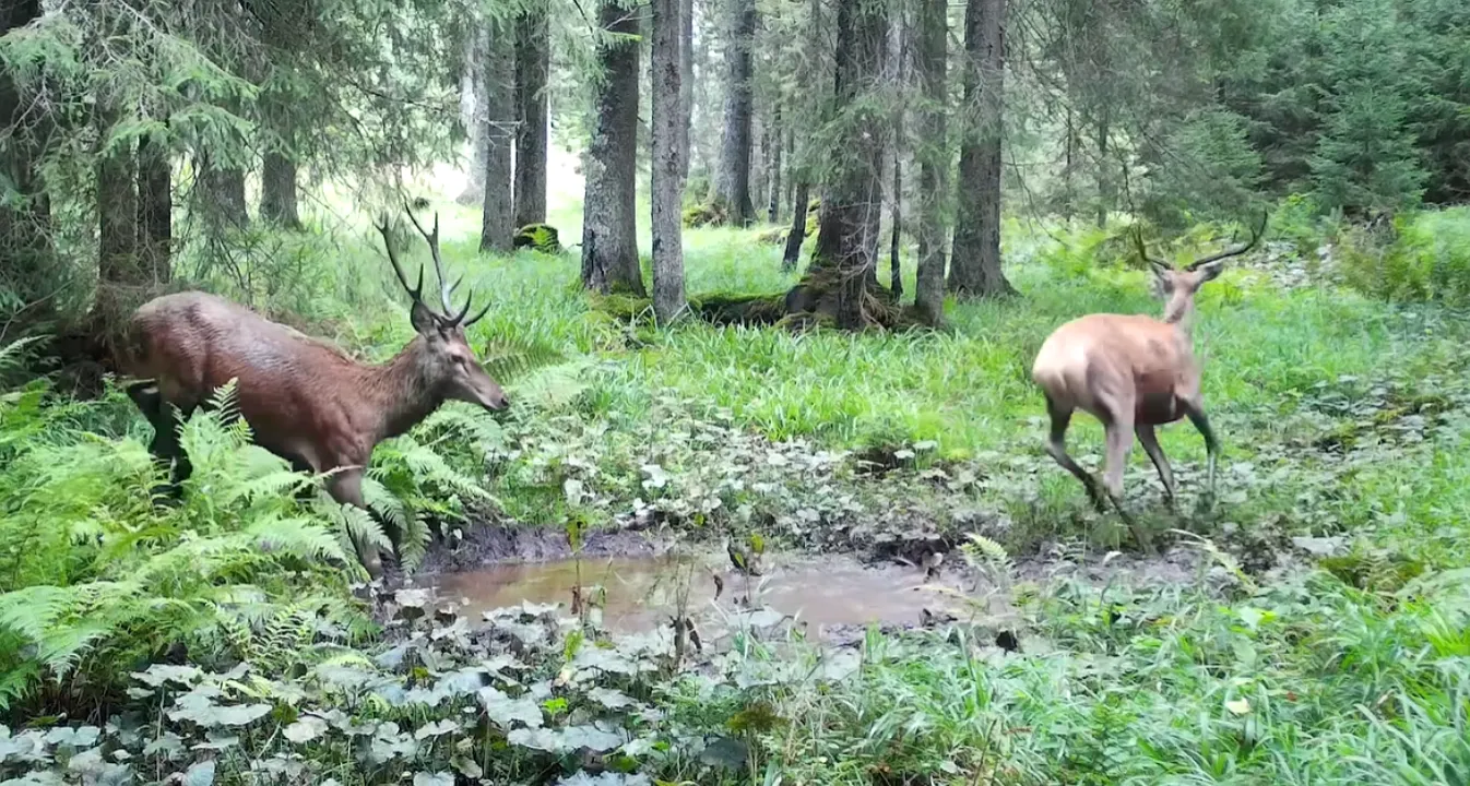 Doi cerbi minunați au fost au fost filmați la scăldat, în perioada boncănitului. Totul a fost surprins cu ajutorul camerelor de supraveghere instalate de specialiștii Romsilva, în Parcul Natural Apuseni.