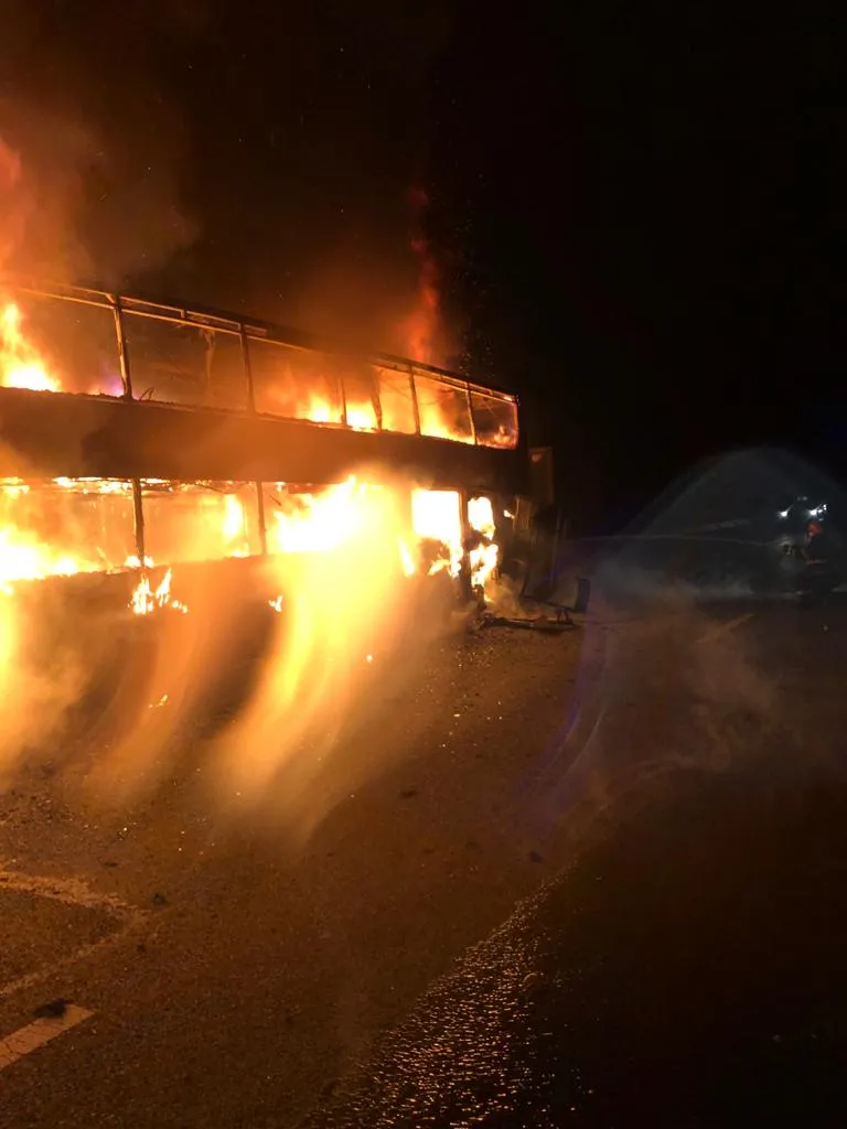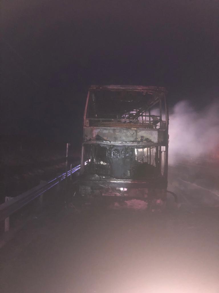 A ars autocarul în totalitate iar cauza probabilă de izbucnire a incendiului a fost determinată de un scurtcircuit electric.