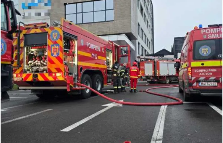 Pompierii militari au intervenit rapid cu două autospeciale de stingere, o autoscară mecanică, o autospecială de primă intervenție și comandă, precum și o ambulanță SMURD. Incendiul a izbucnit într-o cameră tehnică, unde un echipament electric – un server – a cedat și a produs un focar care a generat un volum mare de fum, notează agerpres.ro.