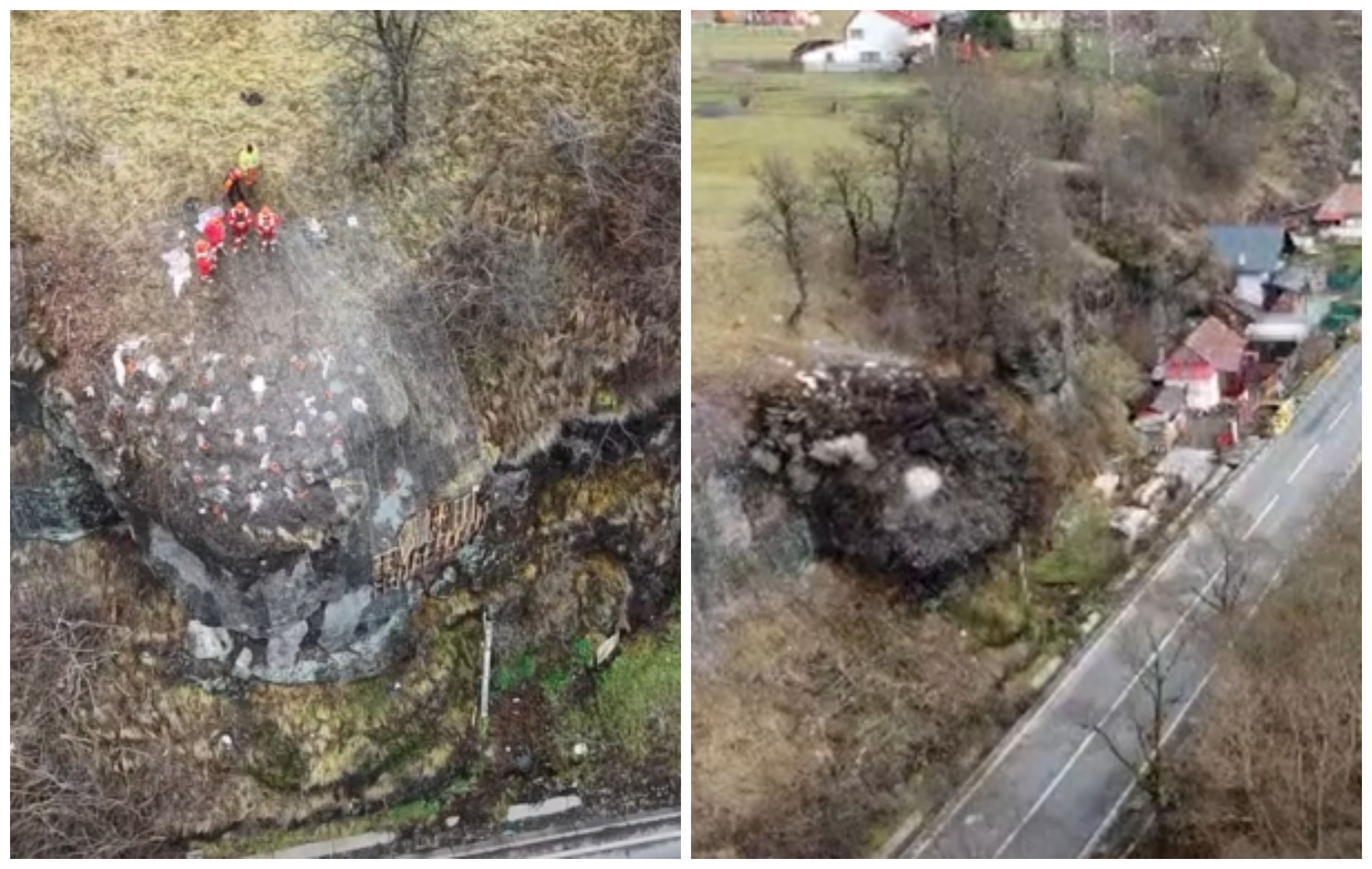 Intervenție de amploare! O stâncă uriașă, de peste 200 de tone, care se putea prăbuși peste un drum națională, a fost detonată VIDEO