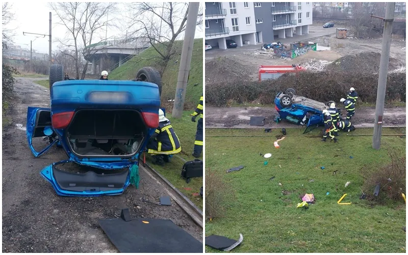 Un autoturism a căzut de pe un pod pe linia de tramvai, din Arad, în urma unui accident din care șoferul a scăpat în mod miraculos.