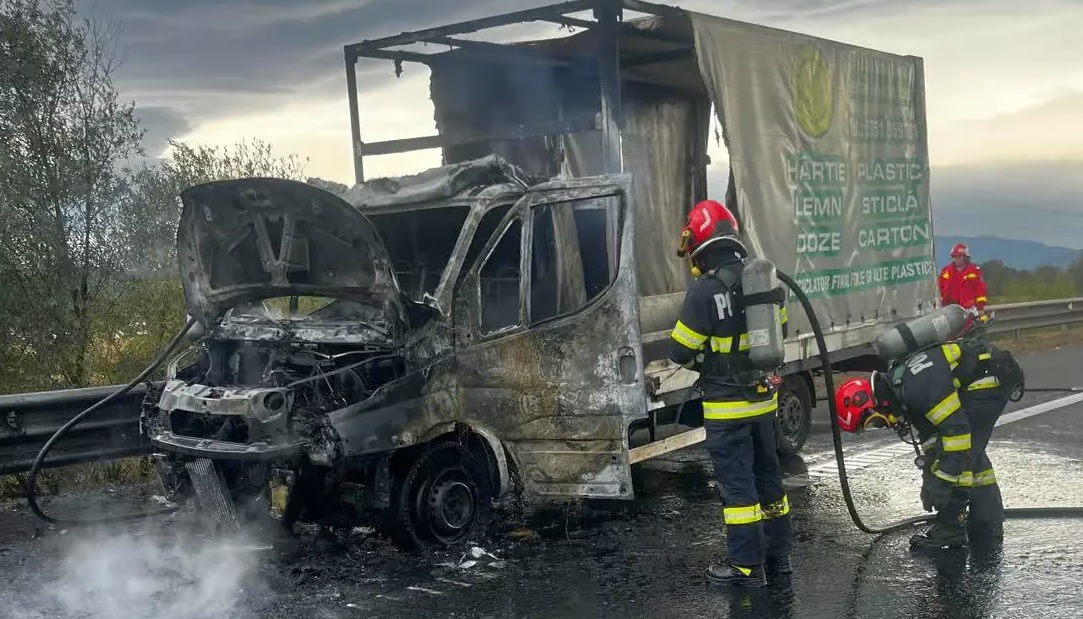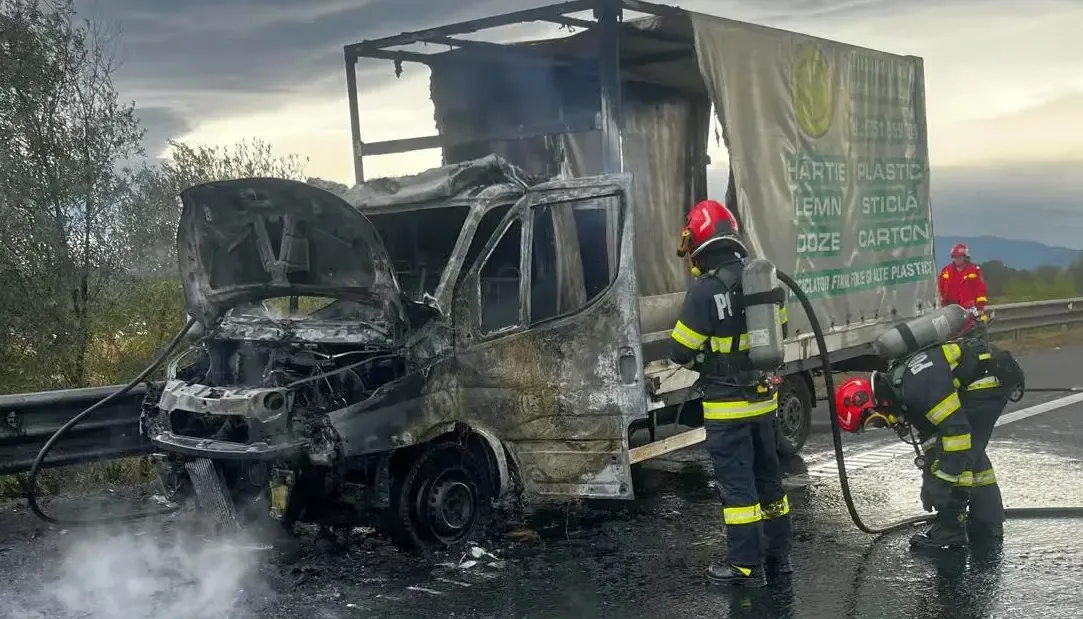 Vineri după-masă, pe autostrada A1 Sibiu-Sebeș, o autoutilitară a fost distrusă de un incendiu.