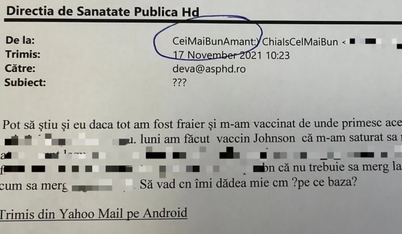 „Pot să ştiu şi eu dacă am fost fraier şi m-am vaccinat, de unde primesc acel voucher de 100 de lei... Luni am făcut vaccin Johnson, că m-am săturat să nu pot merge niciunde", a fost mesajul primit prin email de reprezentanţii DSP Hunedoara, de la "cel mai bun amant".