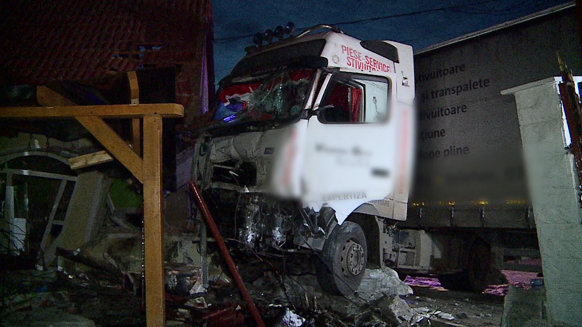 O familie dintr-o localitate din județul Mureş s-a trezit azi noapte cu un TIR în casă. Şoferul a pierdut controlul volanului şi a intrat în clădire