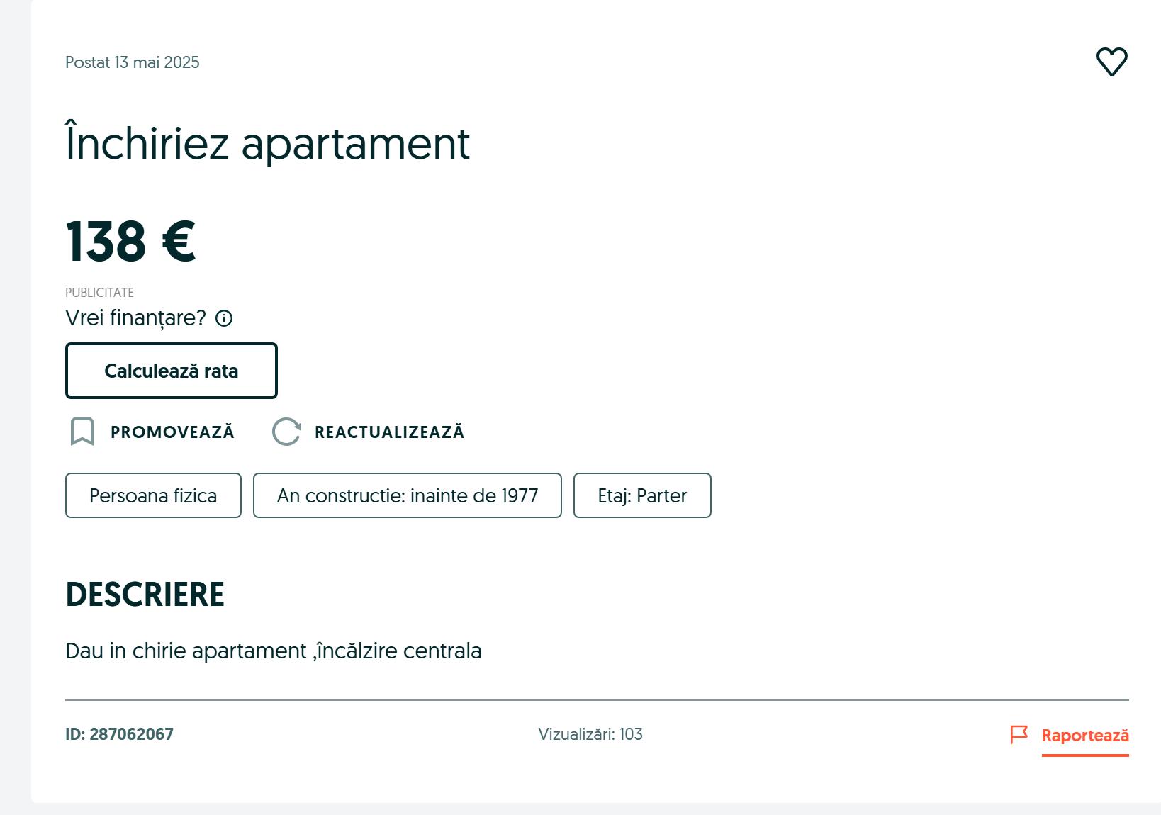 E drept că anunțul postat în 13 mai 2025 nu vine cu poze sau prea multe detalii despre locuință, dar să fim sinceri — la prețul ăsta, e de înțeles. Și chiar și așa, pare o afacere bună într-o țară în care prețurile locuințelor au luat-o razna în orașele mari.