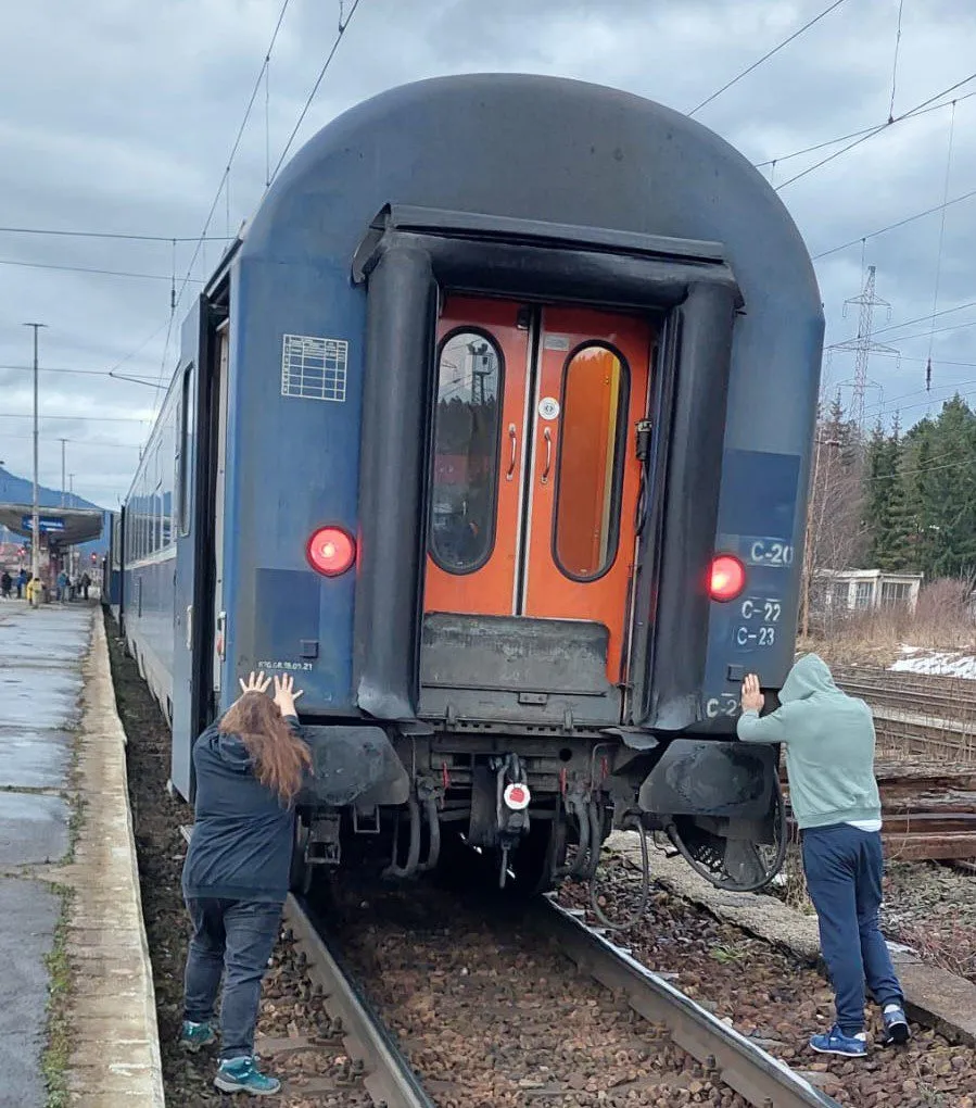Călătorii, probabil plictisiți de timpul de așteptare, au decis să coboare și ,,să dea o mână de ajutor”, împingând trenul, bineînțeles în glumă.