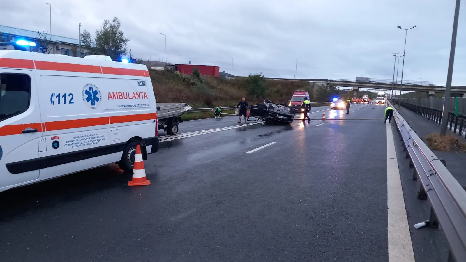 Pericol public pe șosea! Un bărbat a adormit la volan și s-a răsturnat pe autostradă. O persoană a rămas încarcerată