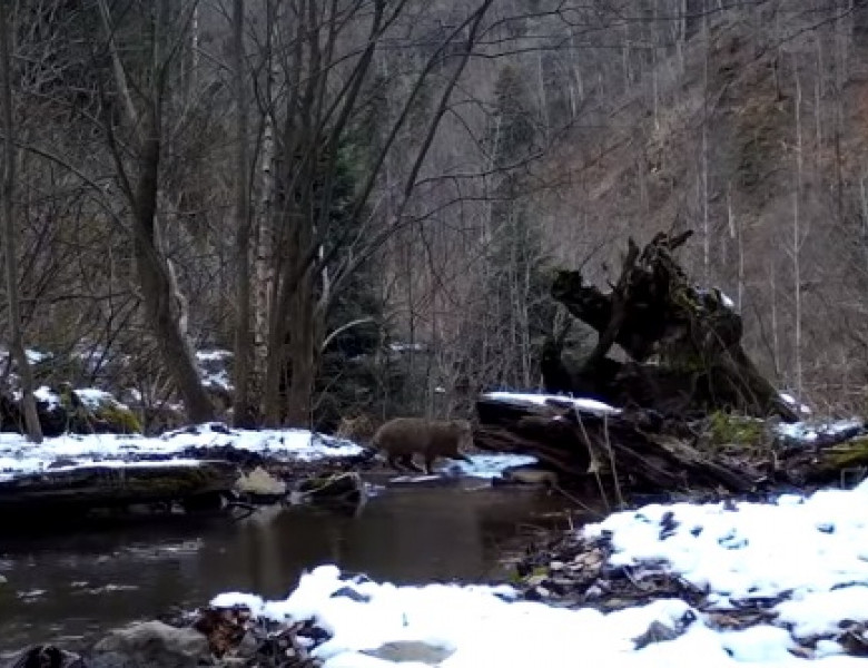 Imagini rare au fost surprinse în Munții Apuseni, acolo unde a fost văzută o pisică sălbatică în timp ce traversa un pârâu.