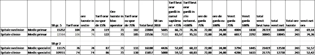 Dacă medicul în discuție are nivelul maxim al sporului pentru gardă (ceea ce se întâmplă rar) atunci tariful orar net pe care-l primește medicul primar pentru garda desfășurată în timpul săptămânii este de: