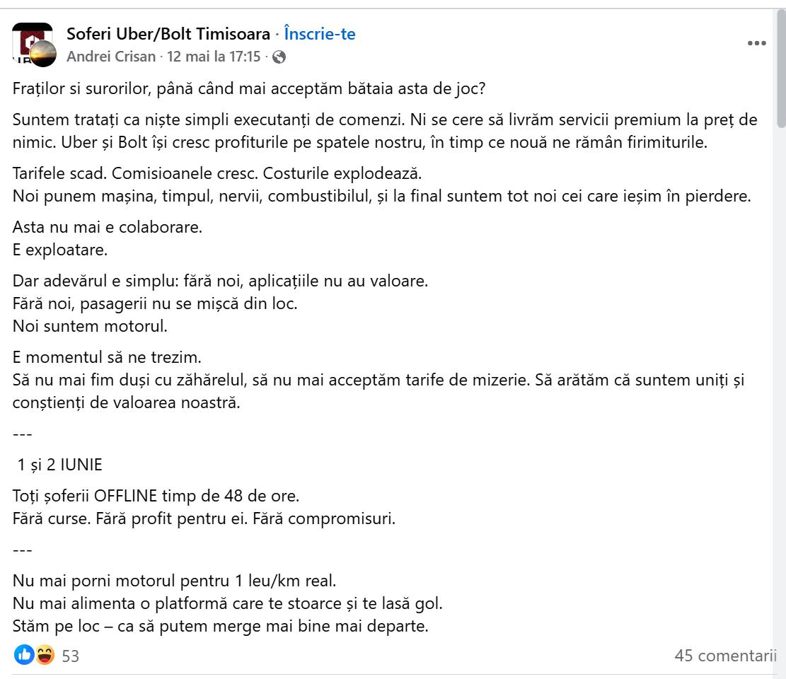 O postare a unui șofer pe un grup de Uber și Bolt/ Timișoara a reaprins nemulțumirile din rândul șoferilor de ride-sharing. Inițiativa venea de la un șofer de ride-sharing care propunea o grevă de 48 de ore pe 1 și 2 iunie. Apelul era clar: „Toți șoferii OFFLINE timp de 48 de ore. Fără curse. Fără profit pentru ei. Fără compromisuri."