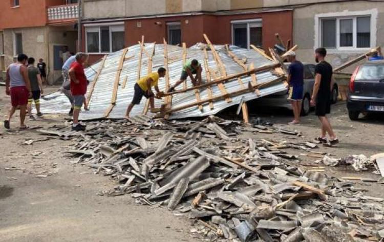 Rafale puternice în Alba! Acoperişul unui bloc s-a desprins, zece maşini au fost serios avariate