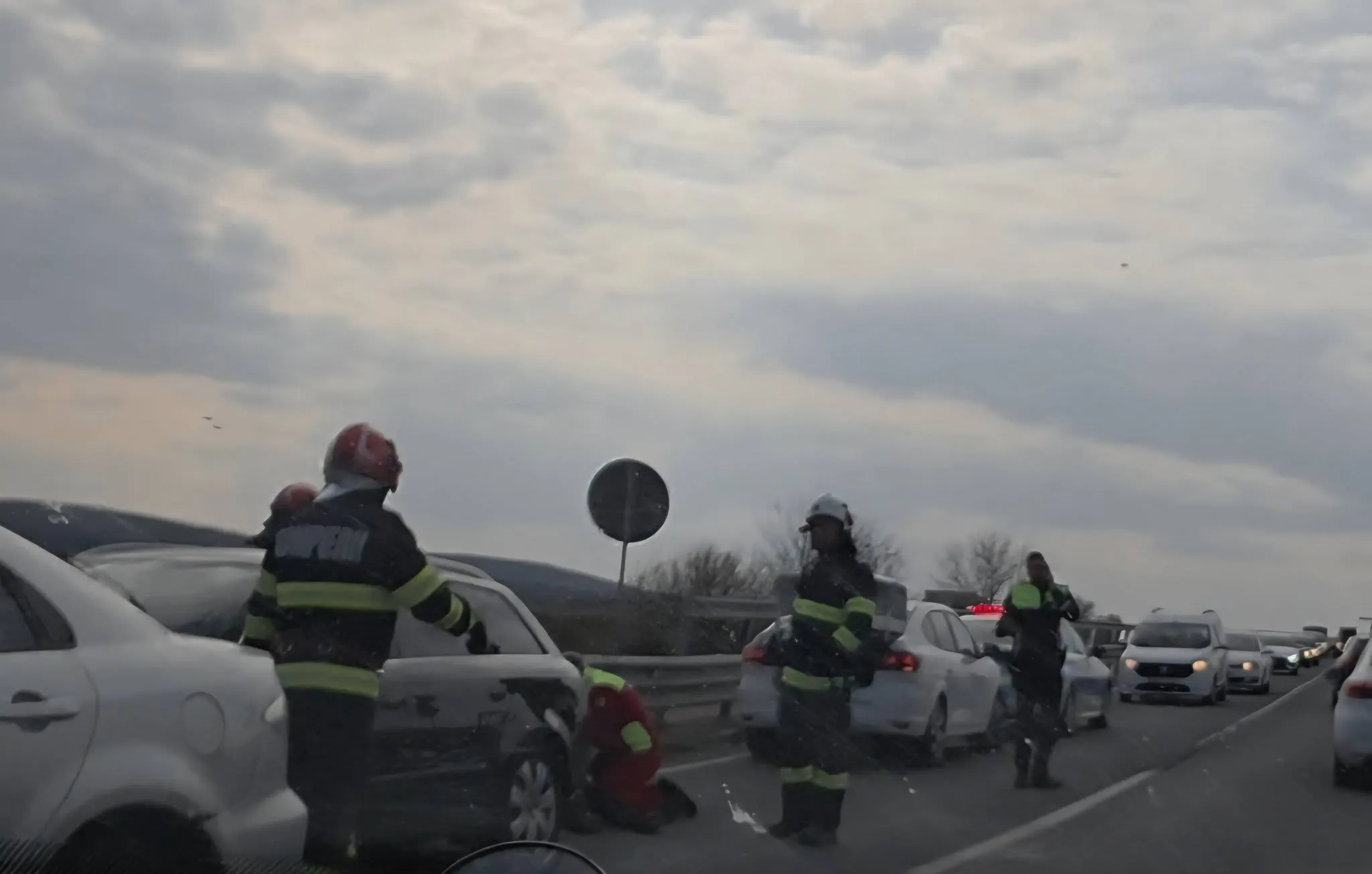 Circulația în zonă se desfășoară cu dificultate, fiind blocată pe o bandă, ceea ce a dus la formarea de coloane de mașini.