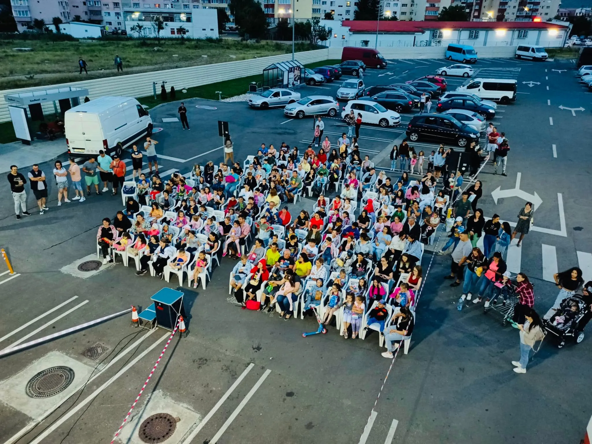 Cuminţi pe scaune, întinşi pe pături sau urcaţi în cărucioare de cumpărături, sute de copii, însoţiţi de părinţi, s-au bucurat de filmul proiectat aseară în parcarea unui hipermarket. Organizatorii au ales pelicula „Deasupra tuturor”, dublată în limba română.