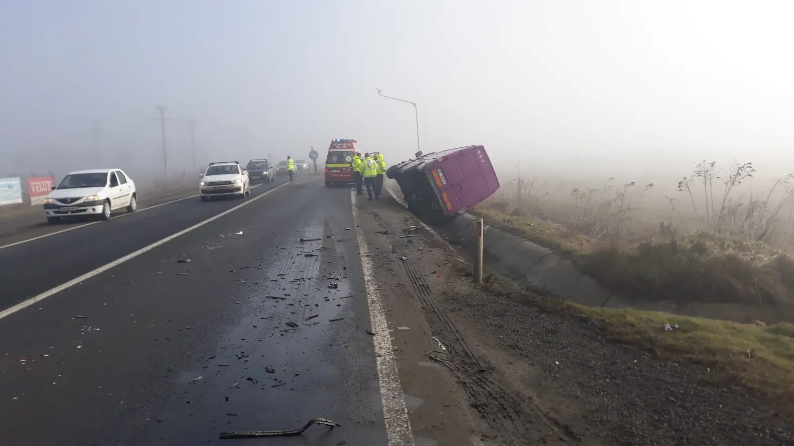 Poliția Sibiu anunță că pe DN 1, la ieșire din Avrig spre Brașov, soferul unui microbuz, care mergea spre Brașov, nu a pastrat distanta de siguranta si a intrat in coliziune cu o autoutilitara al cărei sofer oprise pentru a vira la stanga, neregulamentar. Autoutilitara a fost proiectată într-un autoturism condus regulamentar spre Sibiu.