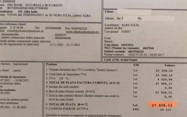 Tot în județul Alba, în luna iulie, un alt abonat a primi o factură la energie electrică în valoare de 207 milioane de lei.