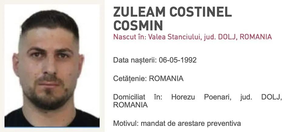 Zuleam Costinel Cosmin s-a născut în același județ, în localitatea Valea Stanciului, la data de 06.05.1992. Individul, în vârstă de 31 de ani, locuia în Horezu Poienari, județul Dolj. Și în cazul lui, Tribunalul Sibiu a emis mandat de arestare pentru omor și două infracțiuni de tâlhărie calificată.