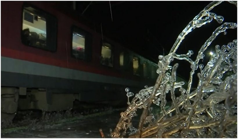 Tren oprit de crengile unor copaci. Zeci de pasageri sunt blocați în frig