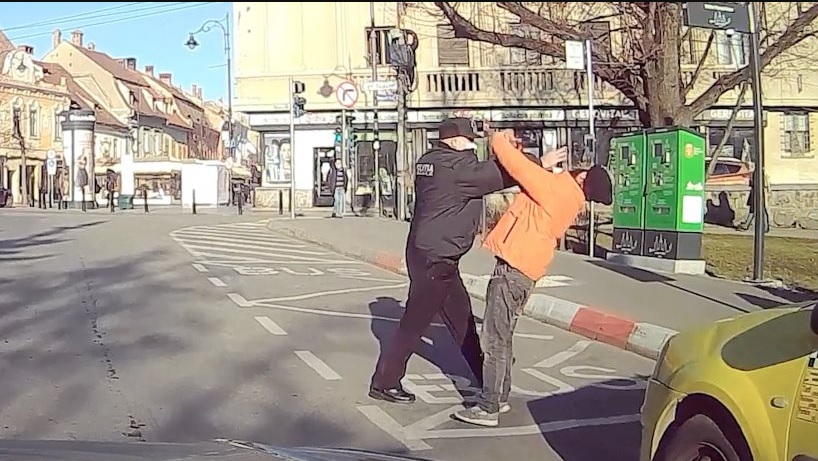 În cursul zilei de sâmbătă, camera de bord a unui șofer a surprins un polițist local din Sibiu, care traversează strada și îl avertizează pe celălalt bărbat că nu poartă mască, lovindu-l apoi în zona gâtului. În urma impactului, bărbatul a ajuns la pământ.