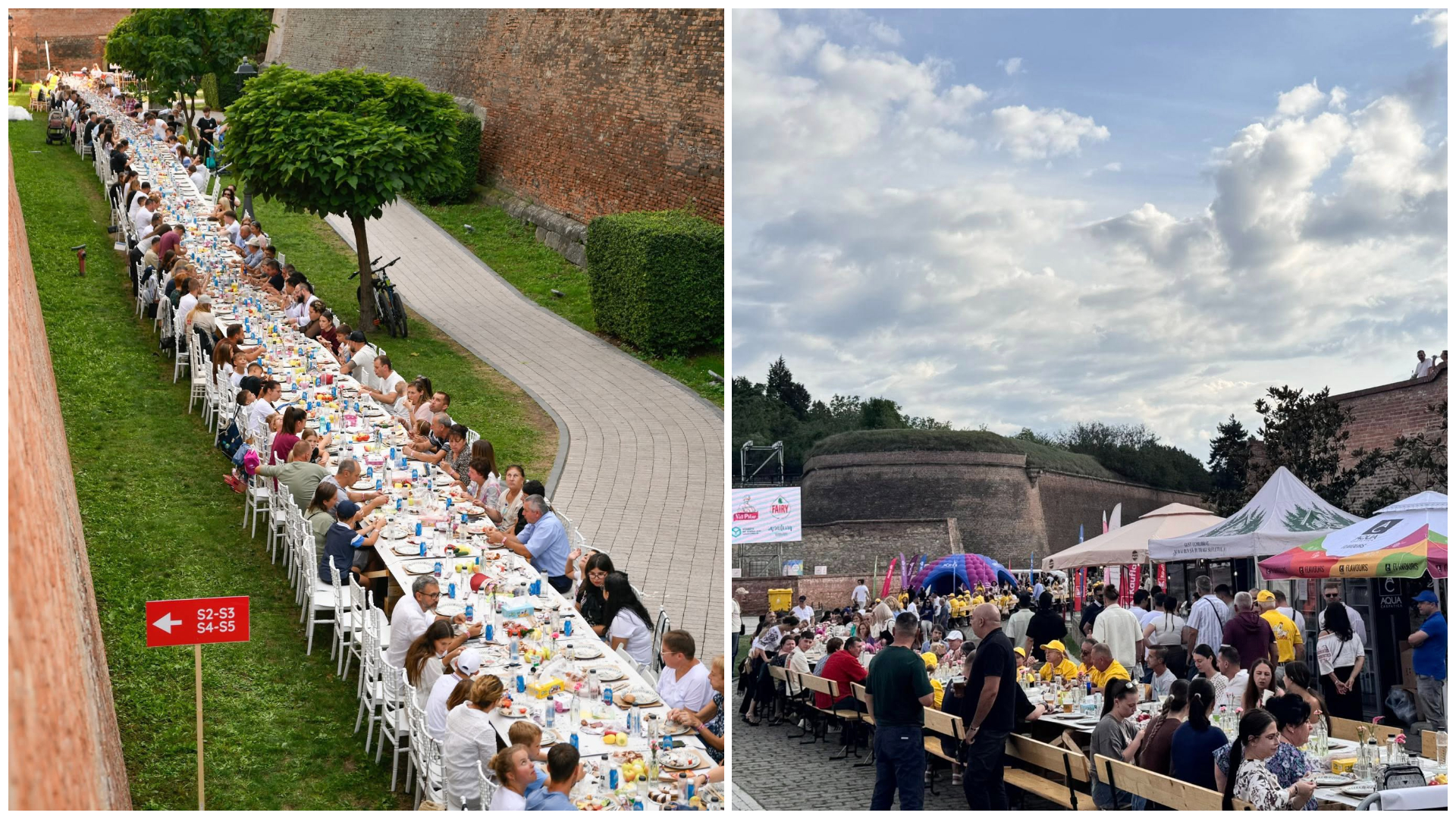 Recordul a fost stabilit cu o masă impresionantă de 2,7 kilometri lungime, amplasată în interiorul Șanțurilor Cetății Alba Carolina. Construcția a fost realizată din aproape 1.500 de europaleți și 2.700 de panouri doka, iar de-a lungul acesteia au fost amplasate 5,4 kilometri de bănci și scaune, conform Digi24.