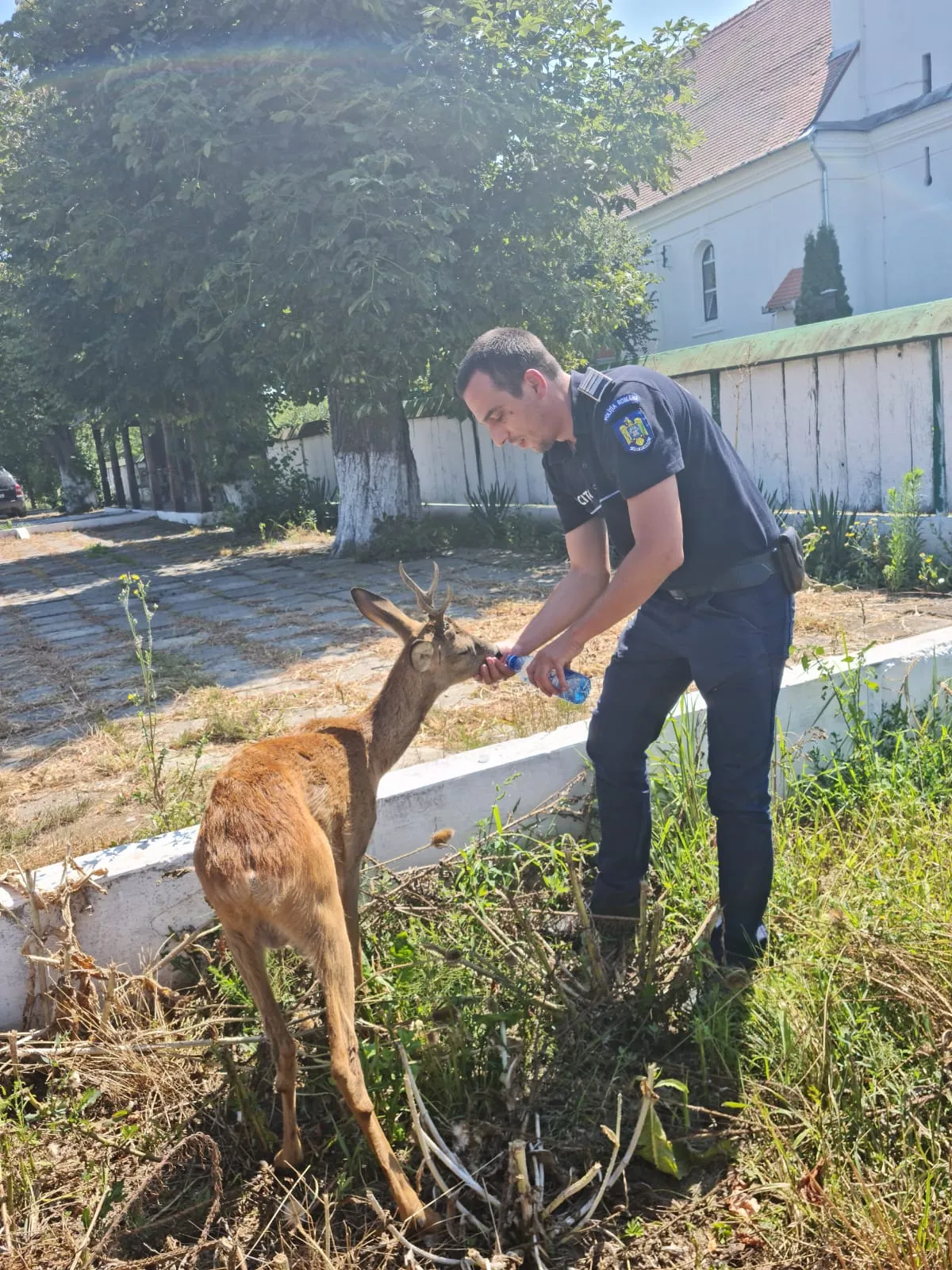 Un polițist i-a dat apă unui pui de caprioară dezorientat și la capătul puterilor - FOTO