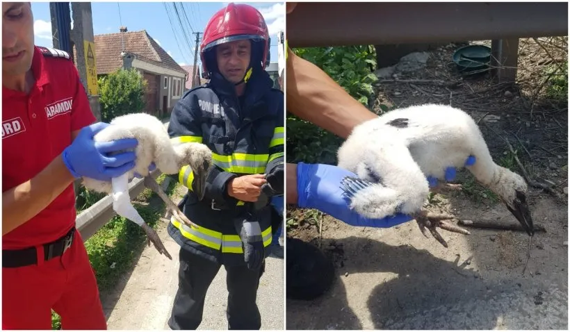 Un pui de barză a fost salvat de pompieri după ce a căzut din cuib - FOTO