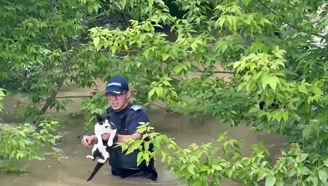 VIDEO Eroi cu suflet mare: Jandarmii au salvat o pisicuță speriată din apele învolburate care au inundat un sat