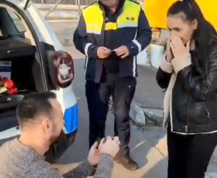 În fața echipajului de Poliție și a trecătorilor, tânărul i-a adresat iubitei sale întrebarea mult așteptată: „Vrei să fii soția mea?”.