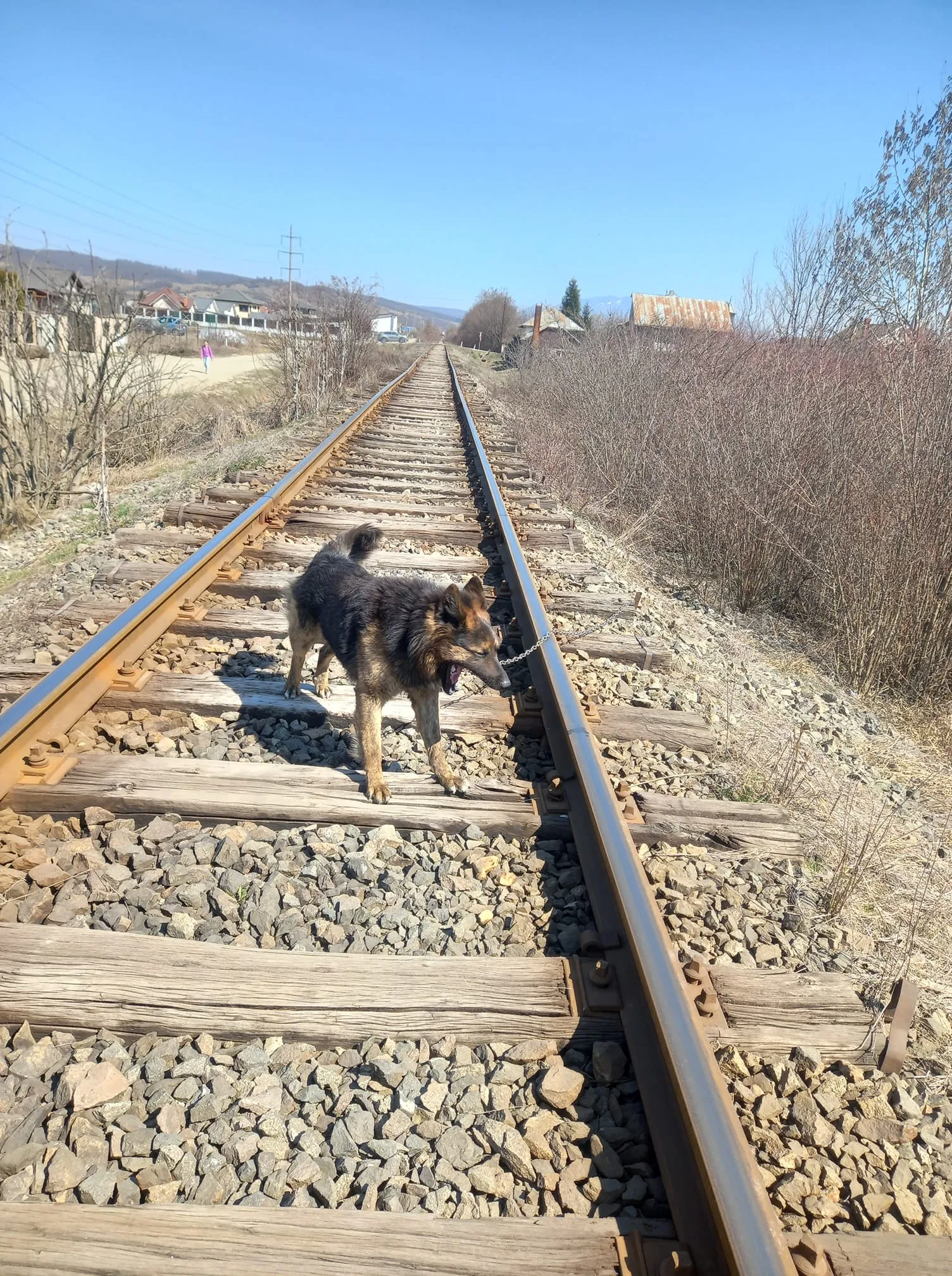Un câine a fost găsit astăzi, luni 28 martie, legat cu un lanț de calea ferată. Deocamdată nu se știe dacă cineva l-a legat intenționat sau cățelului, care ar fi fugit din curtea stăpânei, i s-ar fi agățat lanțul acolo. Poliția Animalelor s-a sesizat și verifică incidentul.