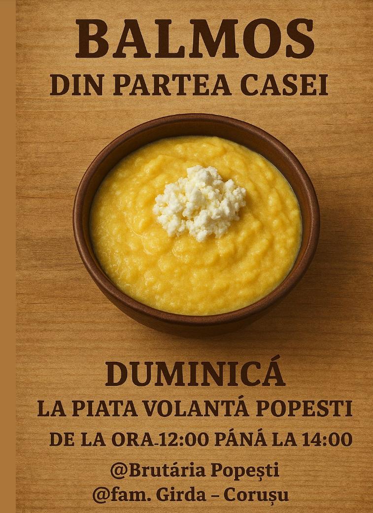 Clujenii sunt invitați duminică, 29 iunie, la un eveniment cu gust autentic românesc: balmoș tradițional gratuit, servit între orele 12:00 și 14:00, în cadrul Pieței Volante Popești, oferit de Brutăria Popești.