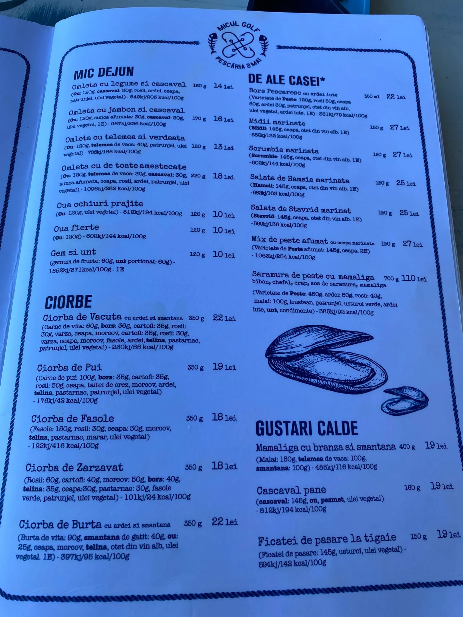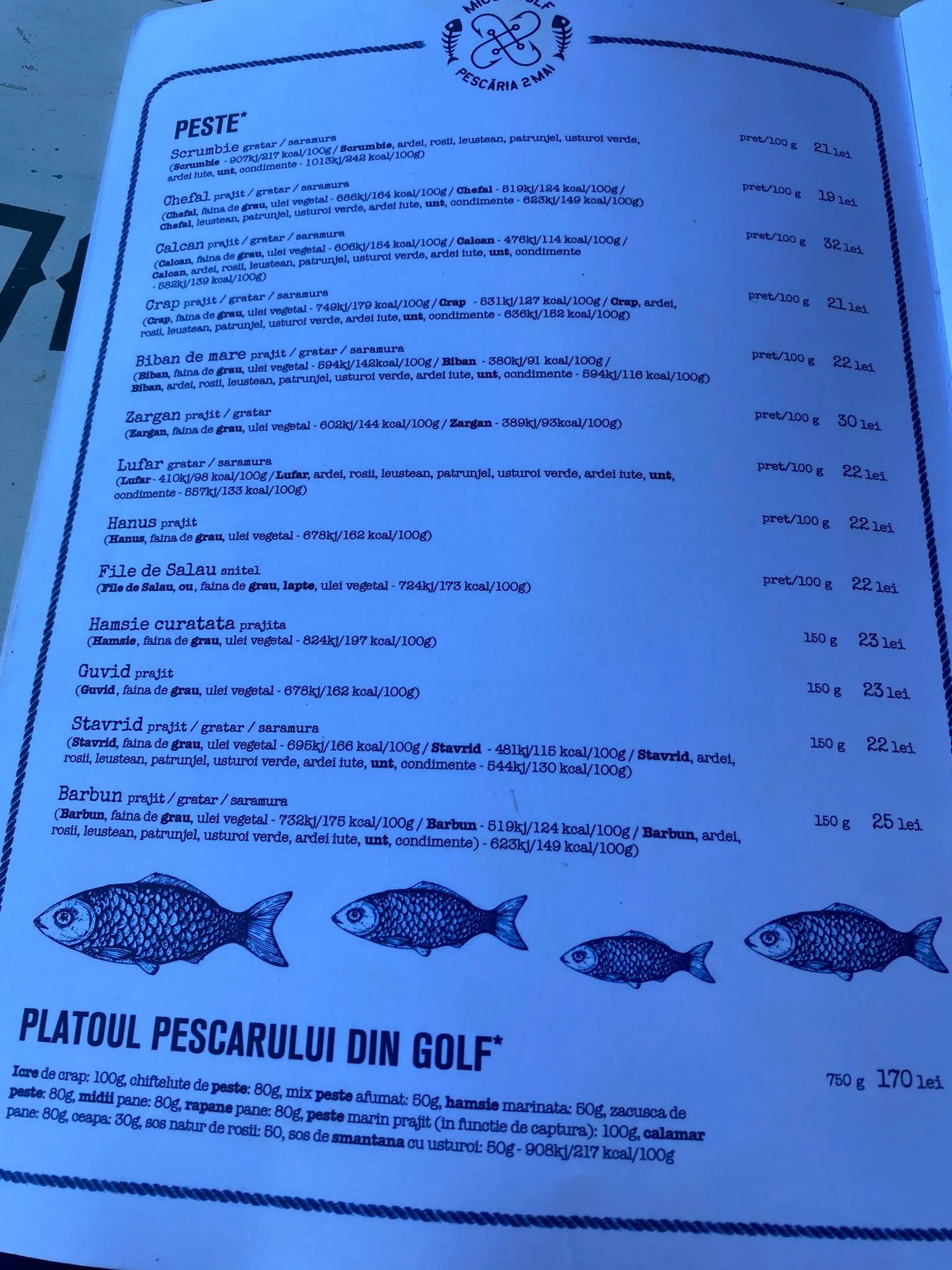 În privința meniului de pește: 150 de grame de hamsii costă 23 de lei, 100 de grame de scrumbii costă 21 de lei, calcanul (100 de grame) 32 de lei, Zărganul (100 de grame) 30 de lei.