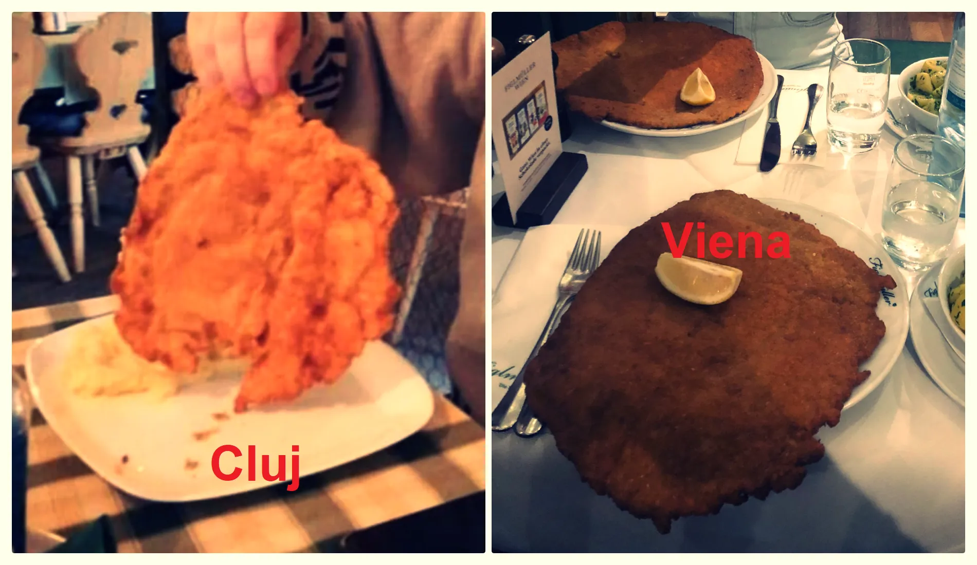 Clujeanul cu logodnica lui au mâncat un astfel de produs la Figlmüller Wien, un local de renume, iar prețul a fost de 20 de euro cu tot cu garnitură și apă. Asta vine cam 100 de lei de persoană, în timp ce la un local clujean un astfel de produs ajunge la 50 de lei, cu tot cu garnitură și ceva de băut.