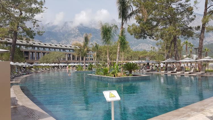 Am vizitat hotelul la mijlocul lunii mai, în cadrul unui infotrip oferit de Hello Holidays, și chiar am locuit acolo câteva nopți, așa că cele relatate sunt pe baza experienței personale. Din cele 480 de camere ale hotelului erau ocupate 100, Turcia fiind în plin lockdown la acea dată (8 mai). Cu toate acestea, în hotel nu se simțeau deloc problemele, pentru că se știe că, în Turcia, turiștii sunt purtați pe palme. Așa a și fost. De la intrare am fost primiți cu șampanie. Aparatele de scanare a temperaturii și-au făcut datoria. Nimeni nu avea febră, slavă Domnului, dar era oricum aproape imposibil să fie probleme pentru că în Turcia se intră cu test PCR.