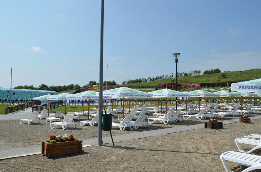 Unul dintre ștrandurile căutate de clujeni este Parcul Balnear Toroc, din Dej, unde te poți bucura atât de plajă și lac, cât și de piscină și topogane pentru cei mici.