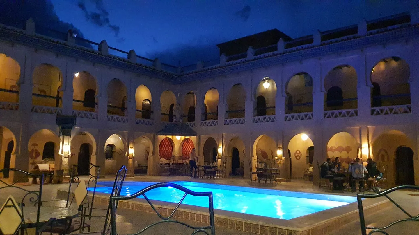 Aproape de granița cu Algeria, la Merzouga (tot în Maroc) au oprit la un superb hotel, cu piscină, ce arată ca într-un film clasic.
