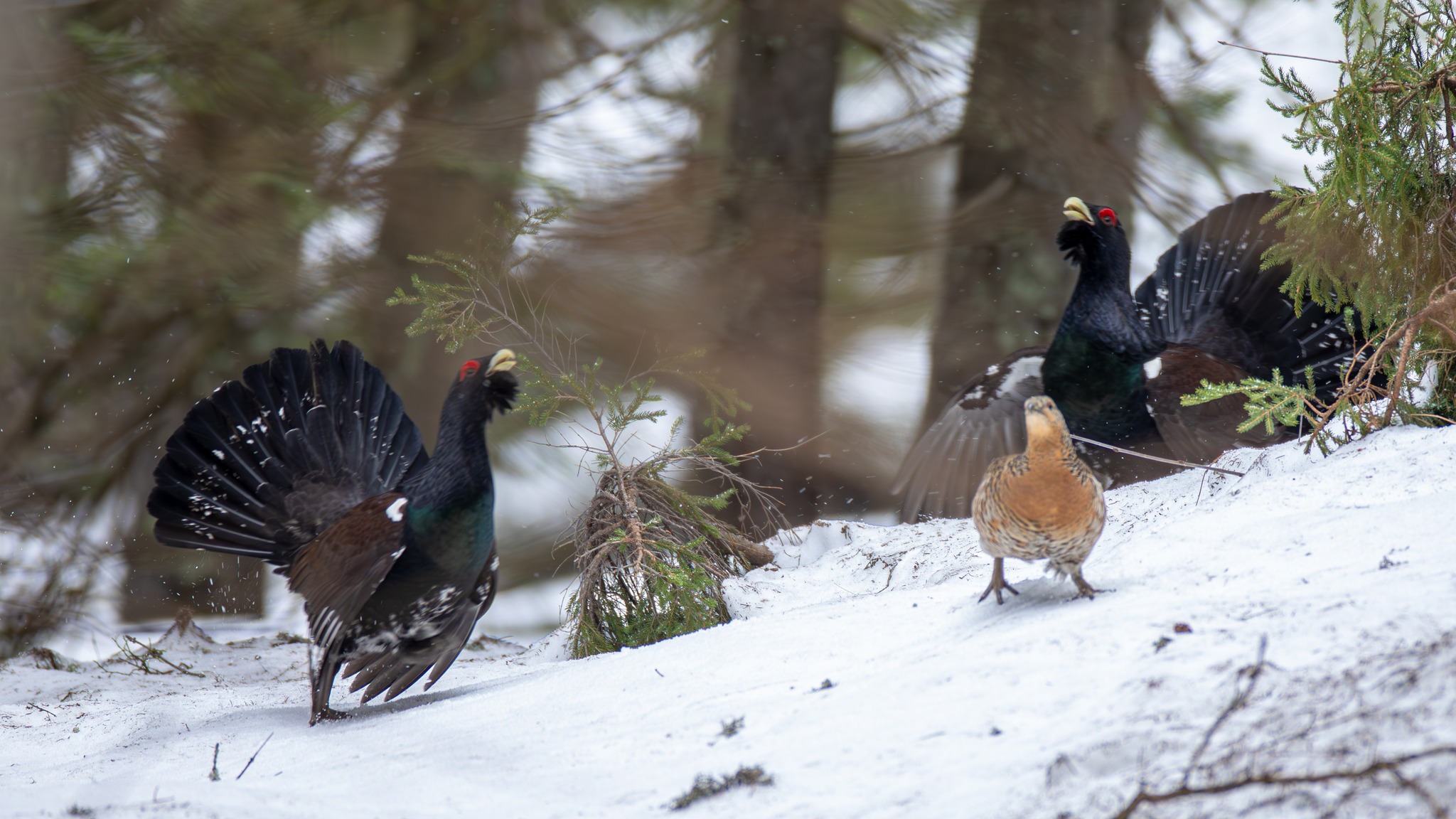 În imaginile surpinse de Florin Coras apar doi cocoși de munte care se duelează pentru atenția unei puicuțe. Masculii își etalează penajul impresionant, se umflă la propriu în pene și scot sunete specifice, într-un adevărat spectacol al naturii. Totul face parte din ritualul de curtare, unde fiecare încearcă să demonstreze că este cel mai puternic și mai atractiv.