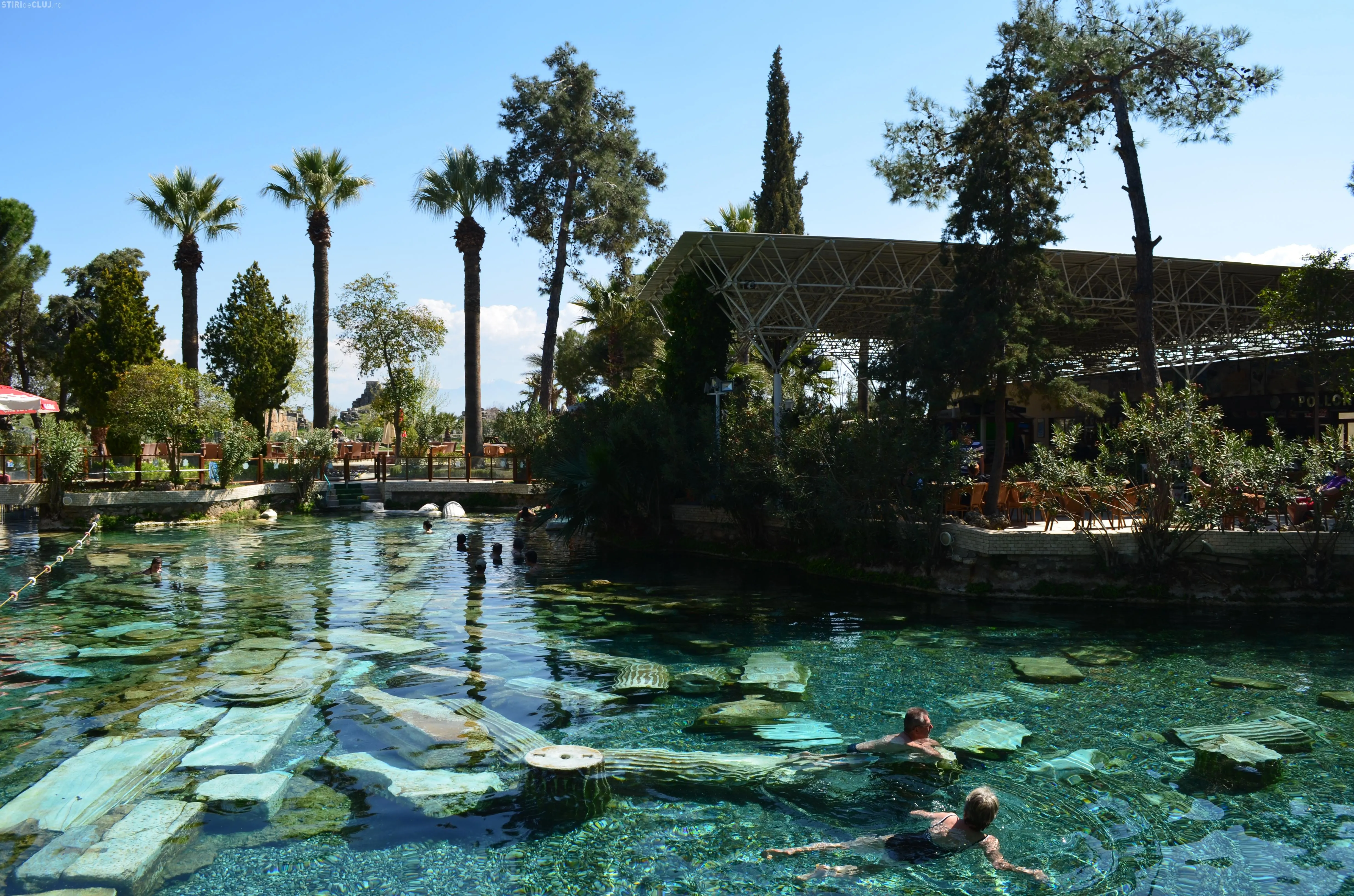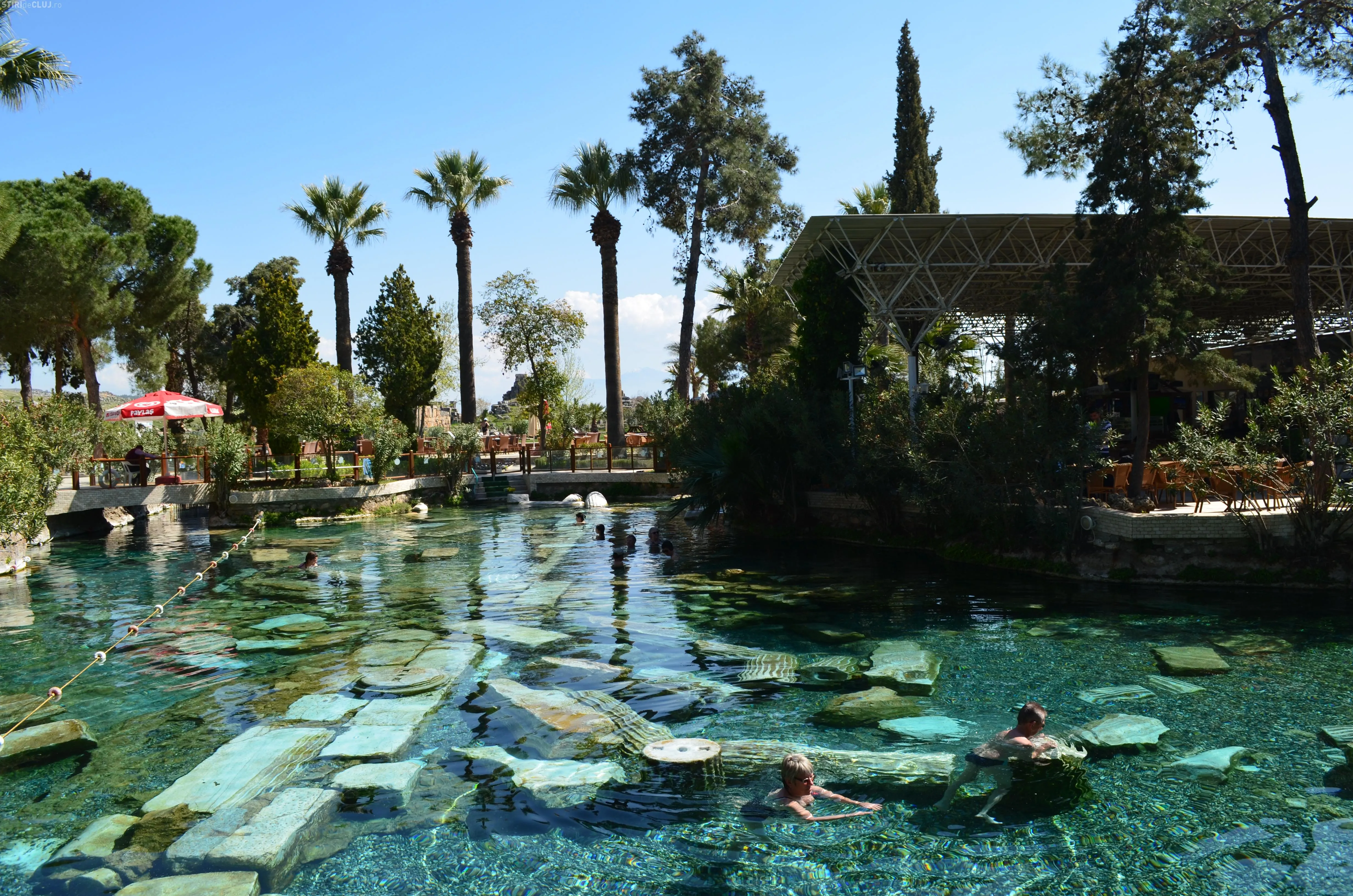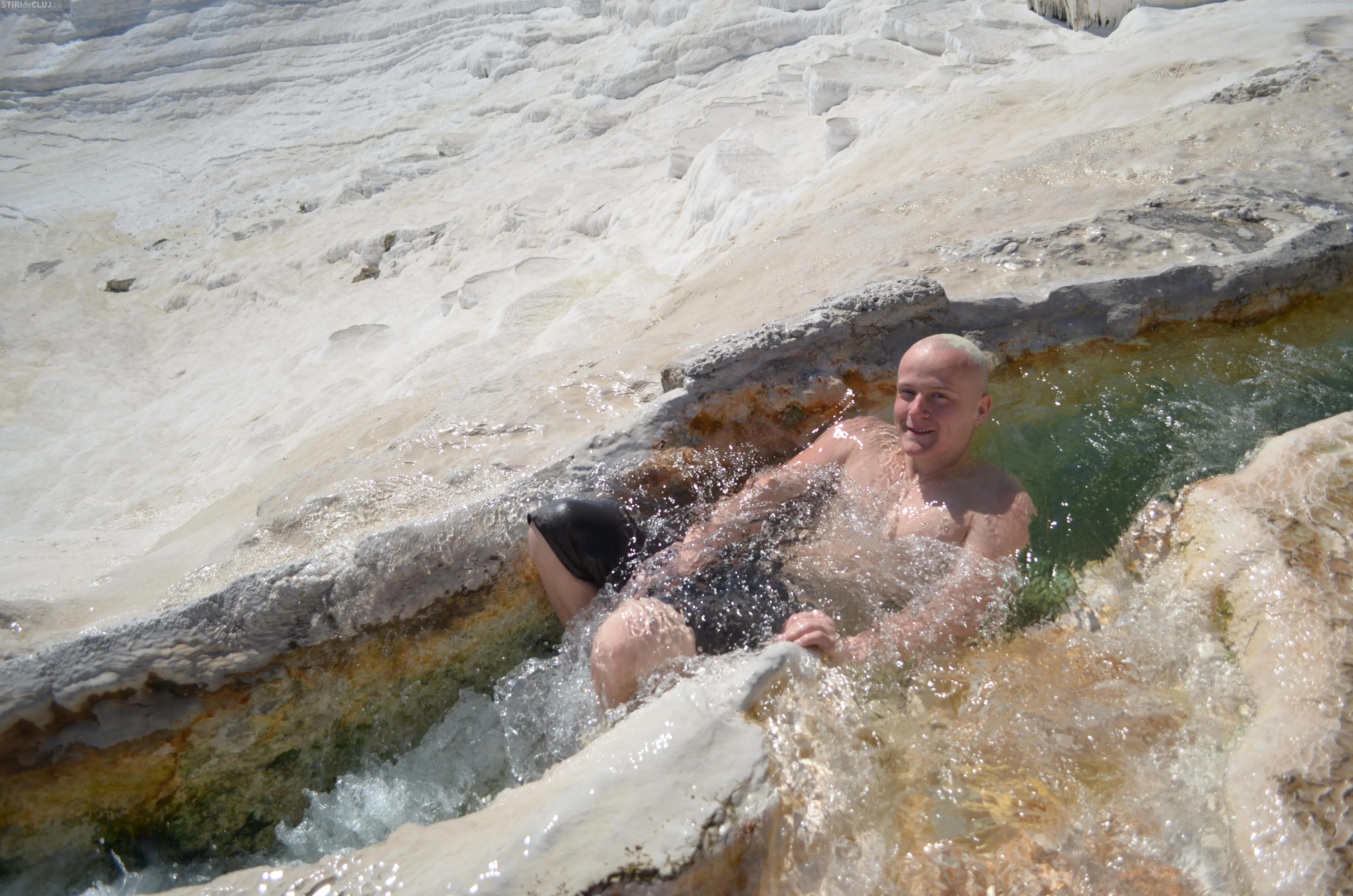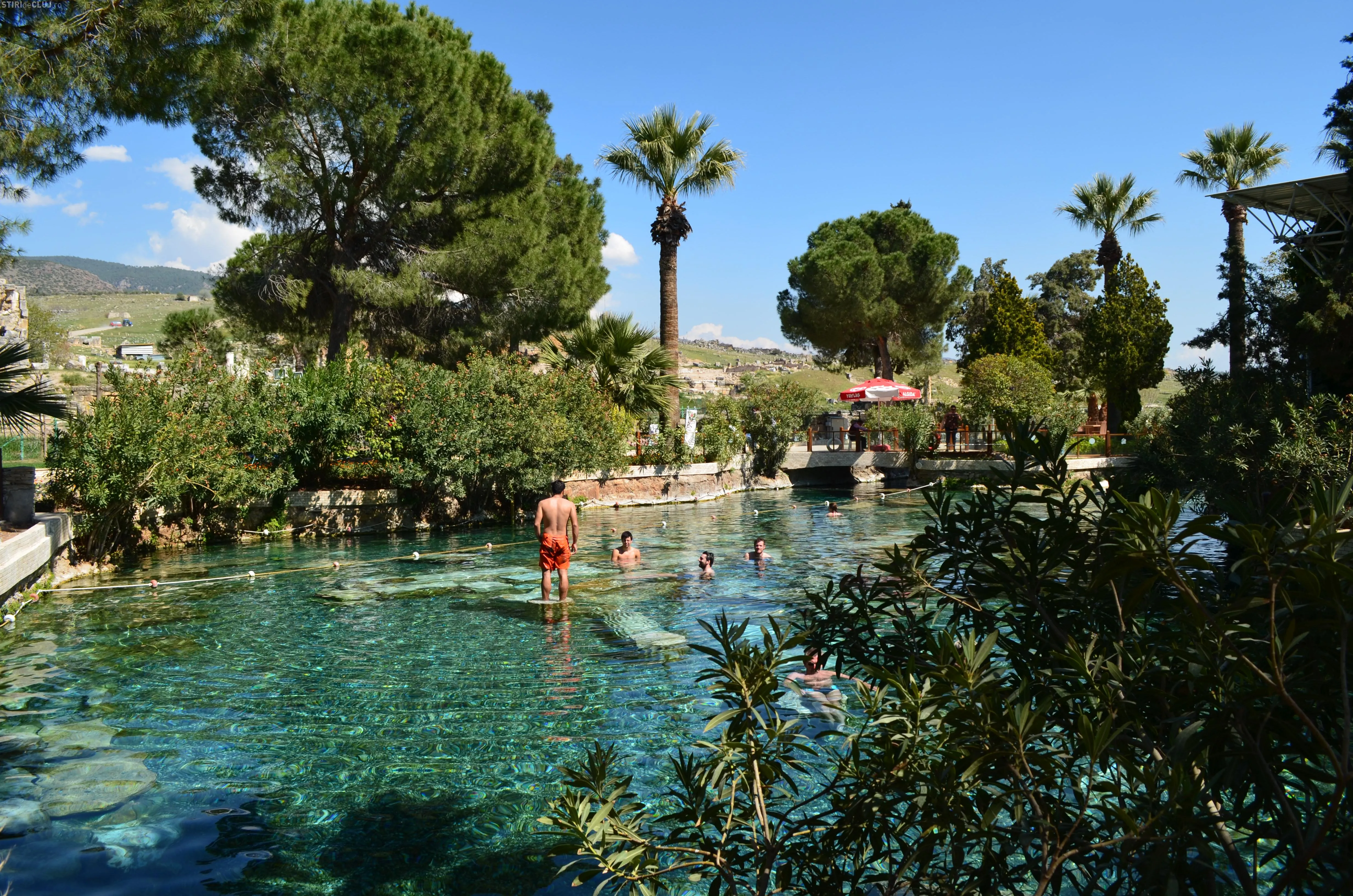 Ajunși acolo, am vrut să vedem mai întâi piscina Cleopatrei, despre care se spune că odată ce te-ai îmbăiat în ea, întinerești cu 10 ani. Am încercat apa cristalină, care are peste 36 de grade și care, la sfârșit de martie, era tocmai bună pentru a face o baie. Miracolele întineririi au întârziat să apară, însă, în cazul nostru, deși toți am fi dat fără regrete timpul înapoi cu 10-15 ani. Poate am fost noi mai ghinioniști, dar cine poate ști în cazul Dvs? Poate că dacă veți testa beneficiile Cleopatrei, veți avea mai mult noroc. Oricum glumele s-au ținut lanț și clipele petrecute la piscină rămân memorabile.