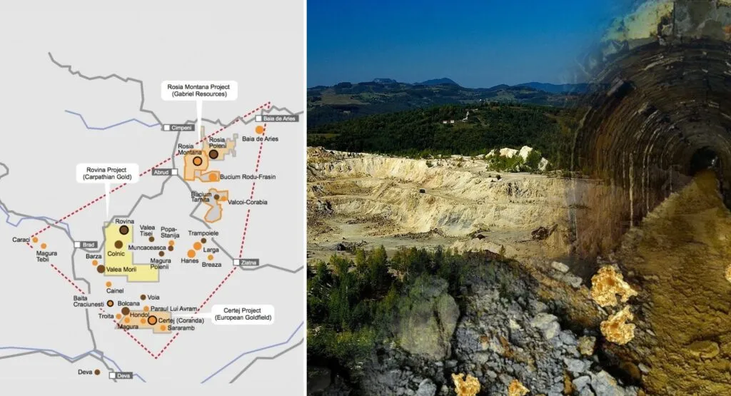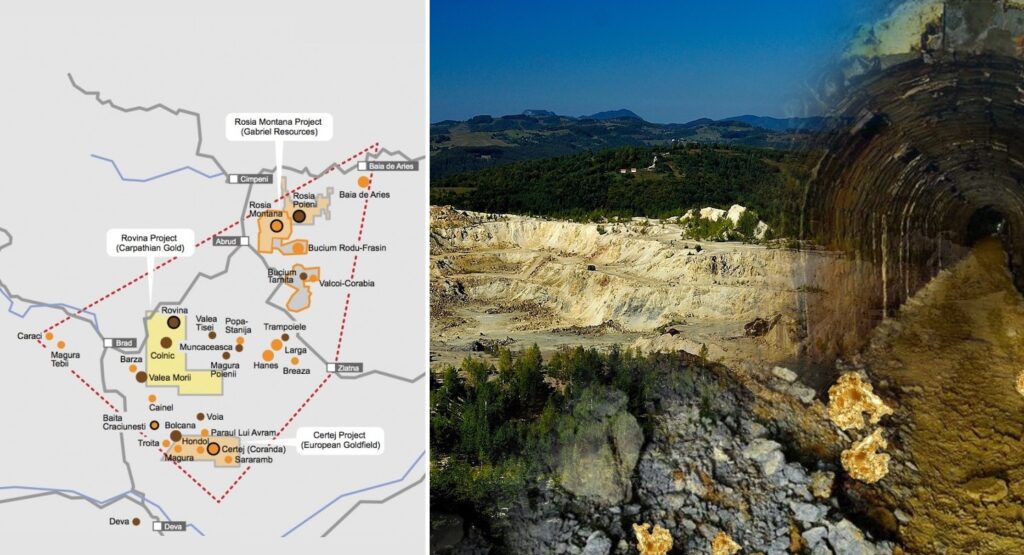 Din punct de vedere al exploatării aurului, cele mai importante locații din „patrulaterul aurifer” sunt: Roșia Montană, Valea Tisei,, Rovina, Cireșata, Colnic și Certej. Estimările specialiştilor arată că în prezent, rezervele directe, care pot fi exploatate, sunt de circa 700 de tone de aur. În perimetrul Roşia Montană sunt aproximativ 300 de tone, la Rovina – aproximativ 200 de tone, iar la Certej – circa 120 de tone.