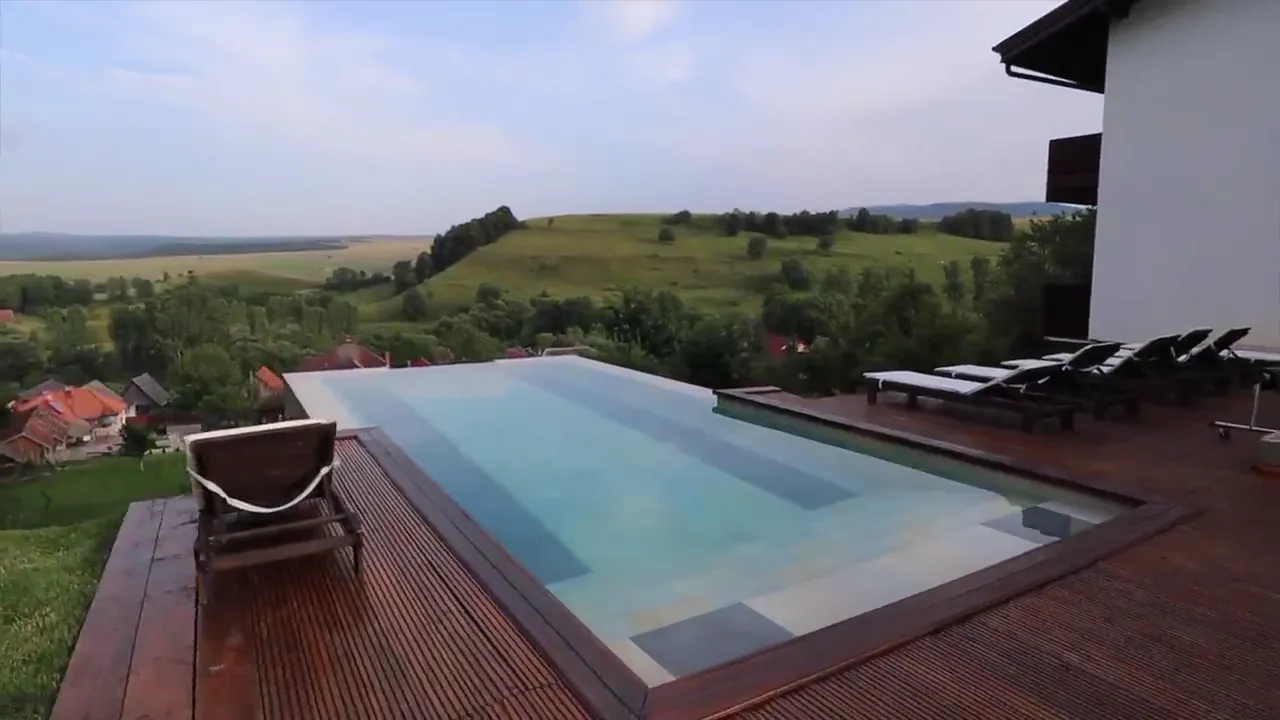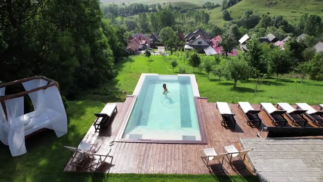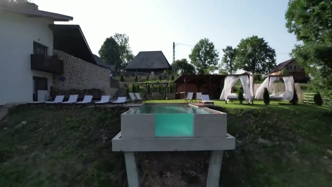 Piscina, punctul central al locului, este încălzită tot timpul anului. Acum are 32 de grade , dar iarna ajunge și la 36 - 37 de grade Celsius. Oamenii din sat au fost reticenți când proprietarul a vrut să ridice pensiunea și să facă piscina, pentru că va consuma toată apa din sat. Nu a fost așa pentru că apa este recirculată, filtrată și curățată cu filtre speciale, se arată în materialul celor de la Hai hui în doi. Materialul video este disponibil mai jos.