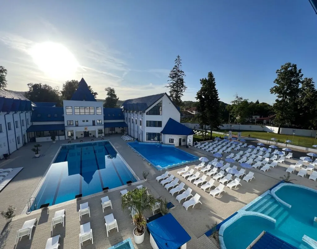 acces la 5 bazine: un bazin semi-olimpic cu apă încălzită, un bazin de relaxare cu șezlonguri și hidromasaj, 2 bazine cu apă termală Vața Băi și un bazin cu apă sărată;