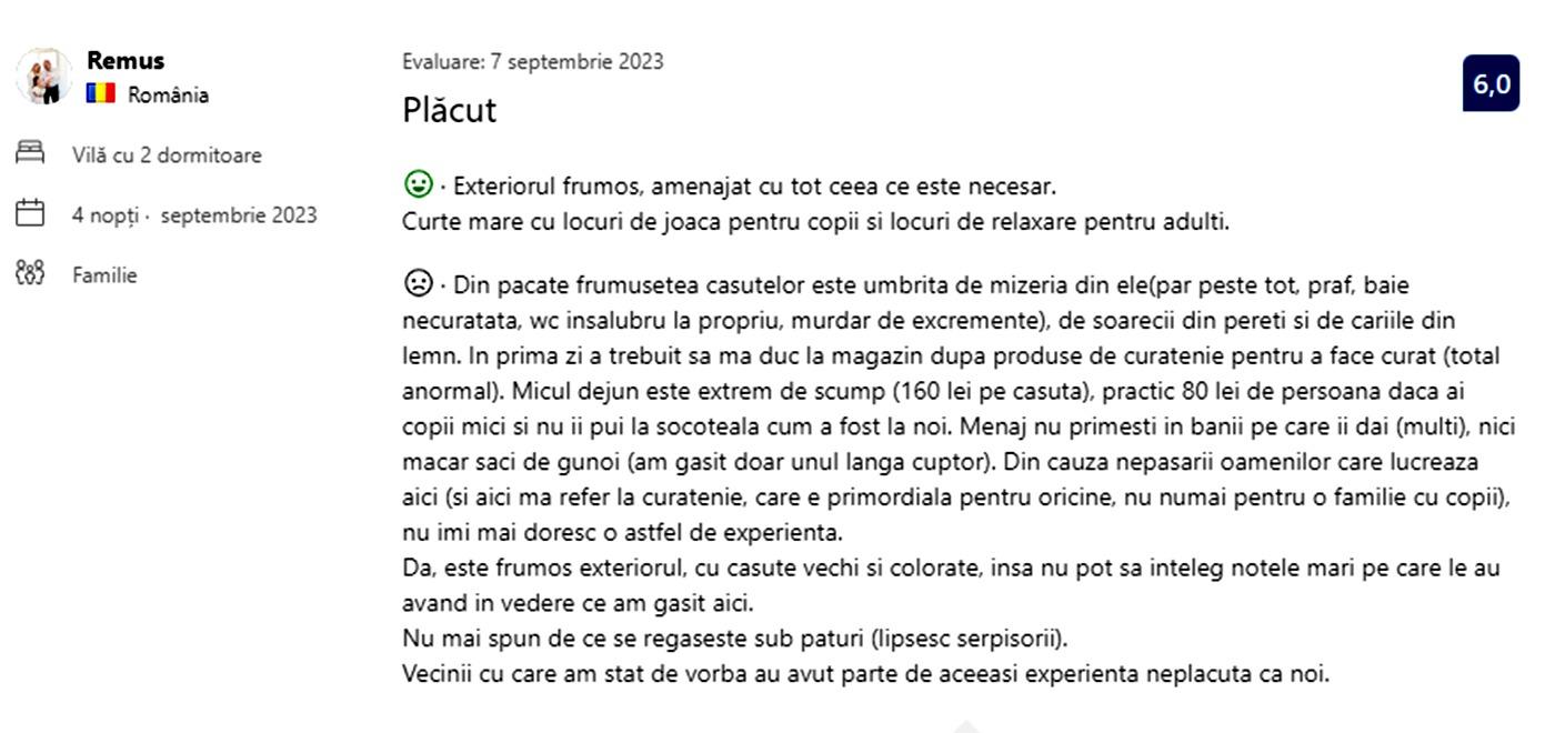 ”Din păcate, frumusețea căsuțelor este umbrită de mizeria din ele (păr peste tot, praf, baie necurățată, wc insalubru la propriu, murdar de excremente), de șoarecii din pereți și de cariile din lemn. În prima zi a trebuit să mă duc la magazin după produse de curățenie pentru a face curat (total anormal). Micul dejun este extrem de scump (160 lei pe căsuță), practic 80 lei de persoană dacă ai copii mici și nu îi pui la socoteală cum a fost la noi. Menaj nu primești în banii pe care îi dai (mulți), nici măcar saci de gunoi (am găsit doar unul lângă cuptor). Din cauza oamenilor care lucrează aici (și aici mă refer la curățenie, care e primordială pentru oricine, nu numai pentru o familie cu copii), nu îmi mai doresc o astfel de experiență.