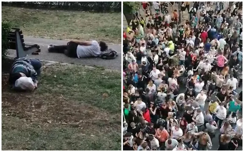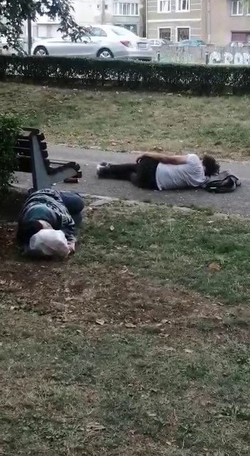 Doi tineri au fost filmați în timp ce se odihneau dimineața, căzuti la datorie. Aceștia nu au mai ajuns până la locația de cazare și au profitat de faptul că afară este cald. Probabil când s-au trezit au continuat petrecerea.