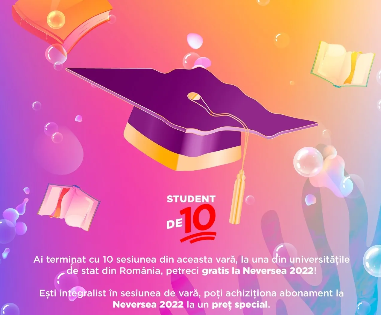 Organizatorii celui mai mare festival de pe o plajă din Europa, Neversea, răsplătesc studenții de 10 ai României cu intrare gratuită în cele 4 zile de festival. Astfel, studenții care termină cu 10 sesiunea din această vară vor avea ocazia să-i vadă pe cei mai îndrăgiți artiști ai momentului și să se bucure de experiențe de neuitat la malul mării.